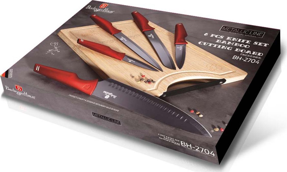 Σετ 5 μαχαιριών με σανίδα κοπής μπαμπού από την BERLINGER HAUS από τη σειρά Burgundy Collection. Σχεδιασμένο για μερίδες κρέατος και ψαριού, κοπή ψωμιού και ξεφλούδισμα και τεμαχισμό λαχανικών. Μαχαίρια από ανοξείδωτο χάλυβα καλύπτονται επιπλέον με αντικολλητική επίστρωση. Εξοπλισμένο με λαβές καλυμμένες με πολύ ανθεκτικό λεπτό στρώμα σιλικόνης για σταθερό κράτημα σε όλες τις συνθήκες.    Χαρακτηριστικά: Υλικό: ανοξείδωτο ατσάλι με αντικολλητική επίστρωσηΙδανικό για καθημερινή χρήση,Οι λεπίδες από ανοξείδωτο χάλυβα εξασφαλίζουν αντοχή και ανθεκτικότηταΜην διατηρούν τις οσμές των τροφίμων,Μην αφήνουν λεκέδες,Εργονομική SOFT Touch λαβή για άνεση κατά την κοπή.Οικολογικό - δεν περιέχει ενώσεις PFOA, μόλυβδο, κάδμιο   Συμπεριλαμβανομένος: Μαχαίρι σεφ 20 εκ Μαχαίρι ψωμιού 20 εκ Μαχαίρι φιλεταρίσματος 20 εκ Βοηθητικό μαχαίρι 12,5 cm Μαχαίρι καθαρισμού 9 εκ Σανίδα κοπής μπαμπού Μαχαίρια συσκευασμένα σε κουτί. Δεν συνιστάται να πλένετε τα μαχαίρια κουζίνας στο πλυντήριο πιάτων  {Application} Universal . {Application} Universal . {Type} Σετ . Σύνολο {Type}